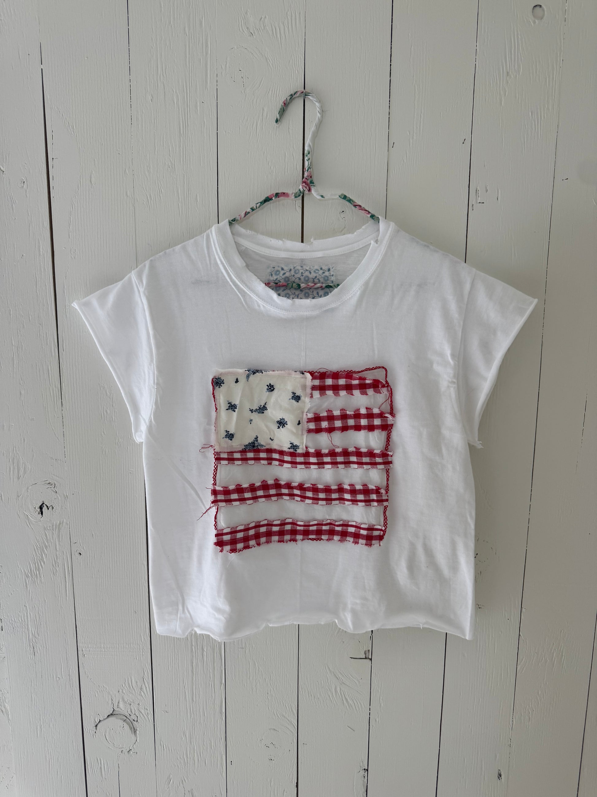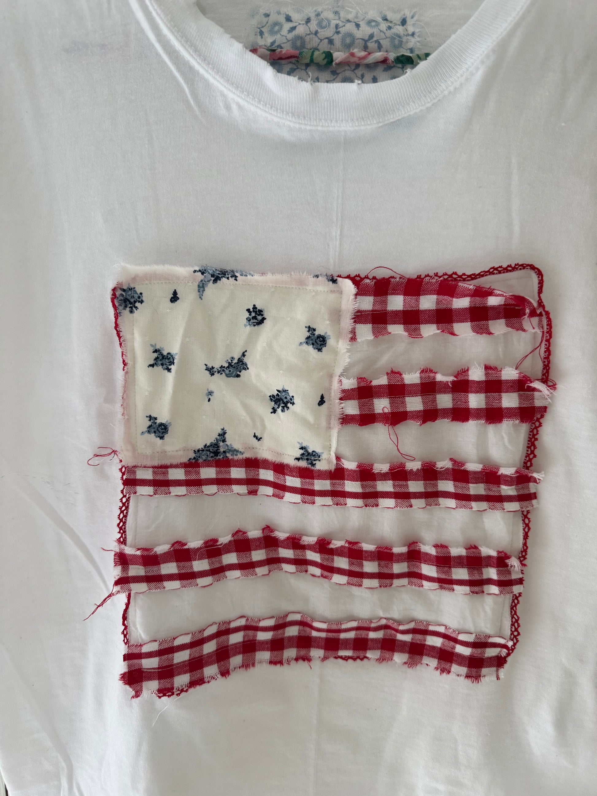 Handmade American flag tee from vintage handkerchief and fabric scraps